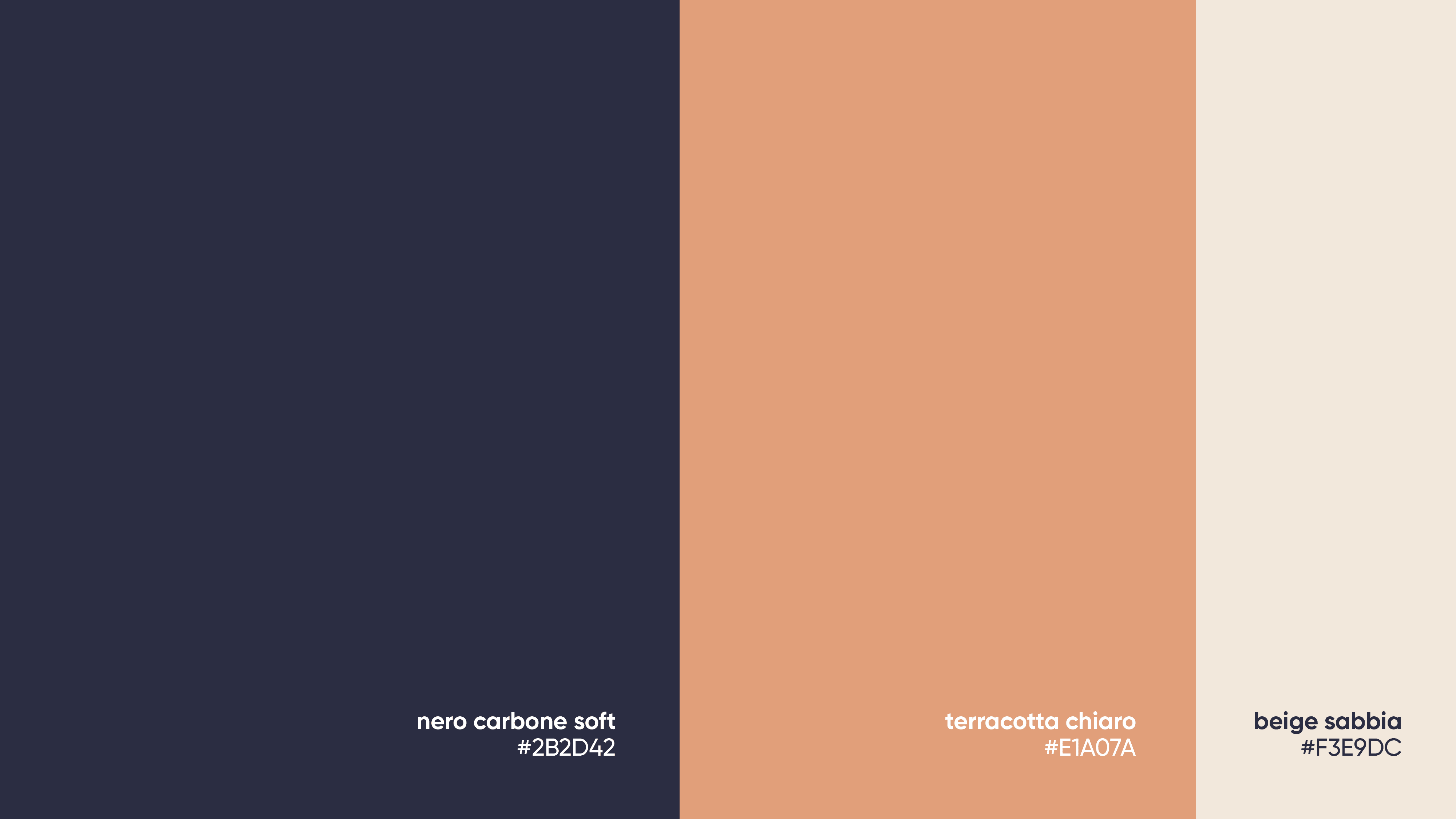 I colori utilizzati raccontano l'affidabilità e la professionalità (il nero carbone soft), la pulizia e l’eleganza (beige sabbia) e la solidità (terracotta chiaro).